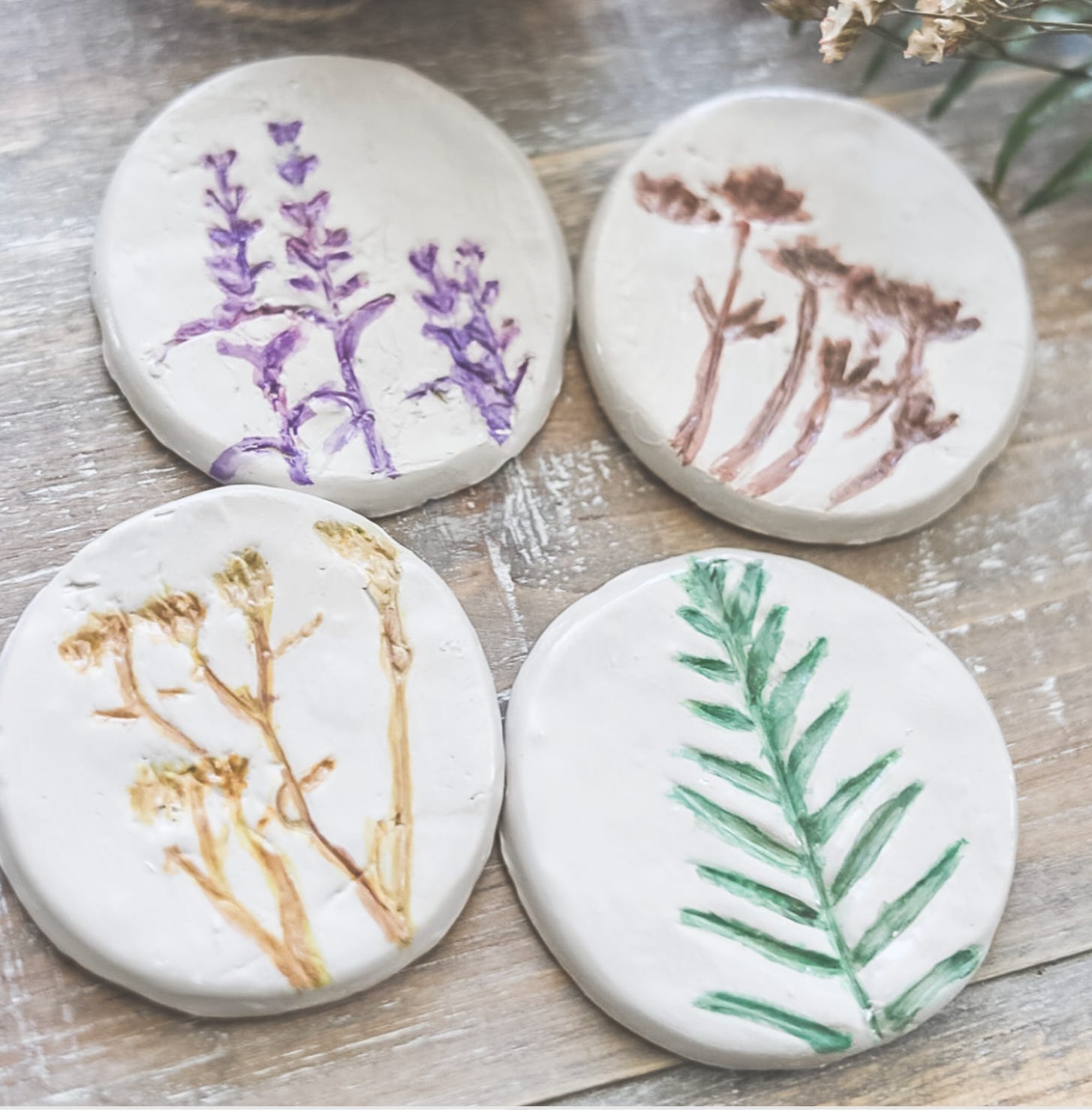 First you should roll our your clay, and then cut it into circles. Take whatever flowers you have chosen and gently press them into the clay with a rolling pin. After this, leave the clay to either air dry or stick it in the oven. Once the clay is dry use your paint to decorate them, then finishing with your clear glaze. As soon as the paint and glaze is dry you should have some wonderful coasters!